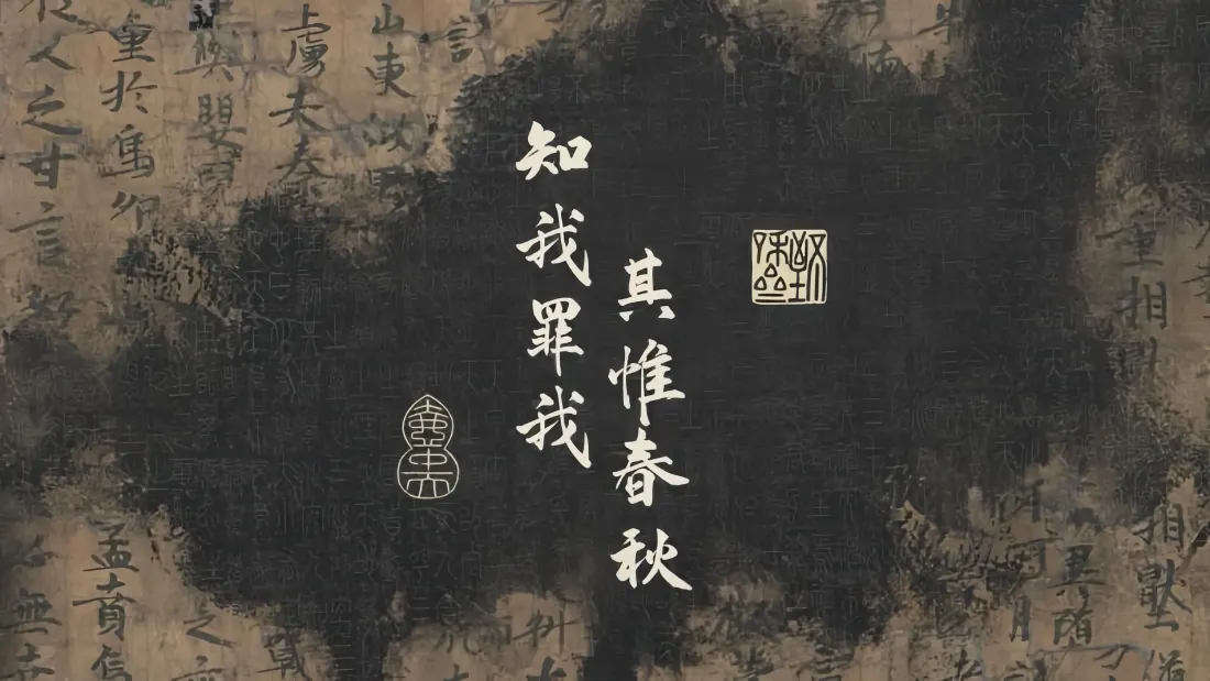 一幅充满哲思的水墨古风壁纸:传统书法”知我罪我,其惟春秋”居中而立,笔触苍劲有力!